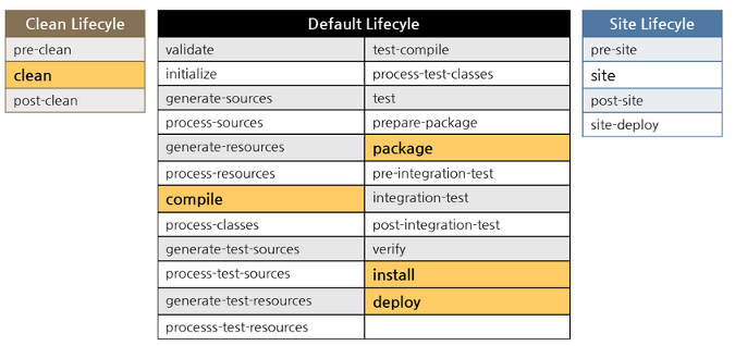 maven build lifecycle은 빌드부터 배포 중에 일어나는 작업을 생명 주기에 빗대 정의한 내용으로 각각의 라이프사이클은 3가지로 분류할 수 있습니다.