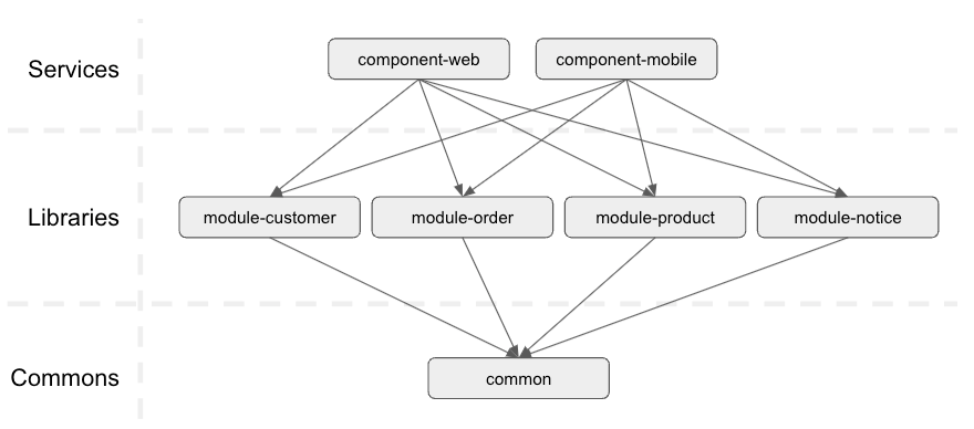 multi-module project 란 단일 프로젝트를 모듈 단위로 나누어 공통적인 기능은 공통 모듈에, 각각의 고유한 기능 및 해당 부분에서만 사용되는 기능은 세부 모듈에 구현을 할 수도 있고, 빌드 옵션에 설정을 줌으로서 특정 프로젝트(모듈)만 빌드를 할 수 있습니다.